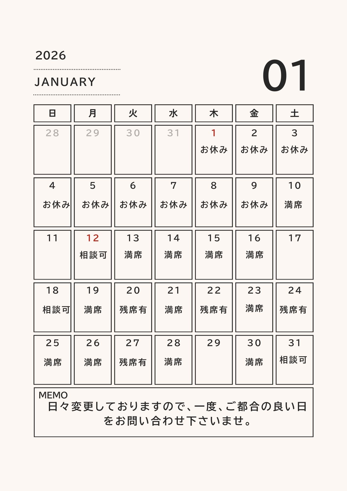 (但し、日程が満席以外の日でよろしくお願い致します。)