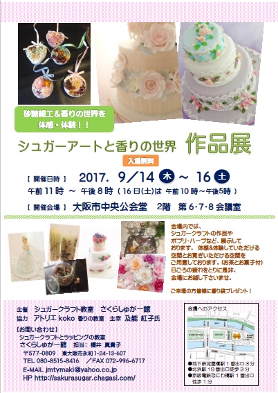 | 「シュガーアートと香りの世界・作品展」 2017年9月14日(木)〜16日(土) 会場:大阪市中央公会堂 ご来場いただきました皆様、有難うございました。 開催時の会場での画像を一部アップしております。 ![]() |