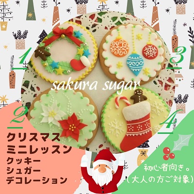 | 「クッキーシュガーデコレーション」 こちらのレッスンは終了しております。 ![]() 入会金不要 ※初心者の方〜対象です。 ※全く初めての方でも制作に、講師がお手伝い致しますので、ご安心下さいませ。 【 レッスン内容 】 市販のクッキーに シュガーペーストやアイシングを使用して クリスマスのデコレーションします。 4種類のデザインがございますが上の画像の @〜Cの中から選んで作っていただけます。 どのデザインでおつくりになられるかお申込みの際にお伝えください。 画像 左上1 ・ 左下2 ・ 右上3 ・ 右下4 (色は、あらかじめこちらで着色させていただきます。) ※ レッスン時間は、1個につき 約1時間くらいです。 (作られる方のペースで多少前後します。) 【 レッスン開講日時 】こちらのレッスンは終了しました。 【 レッスン料 】1レッスン (材料費・テキスト代込み 箱付)
